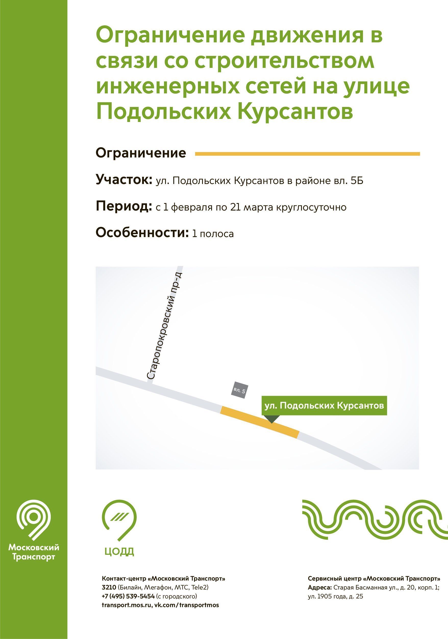 С 1 февраля по 21 марта в связи со строительством инженерных сетей будет круглосуточно ограничено движение транспорта по одной полосе на улице Подольских Курсантов в районе домовладения 5б.