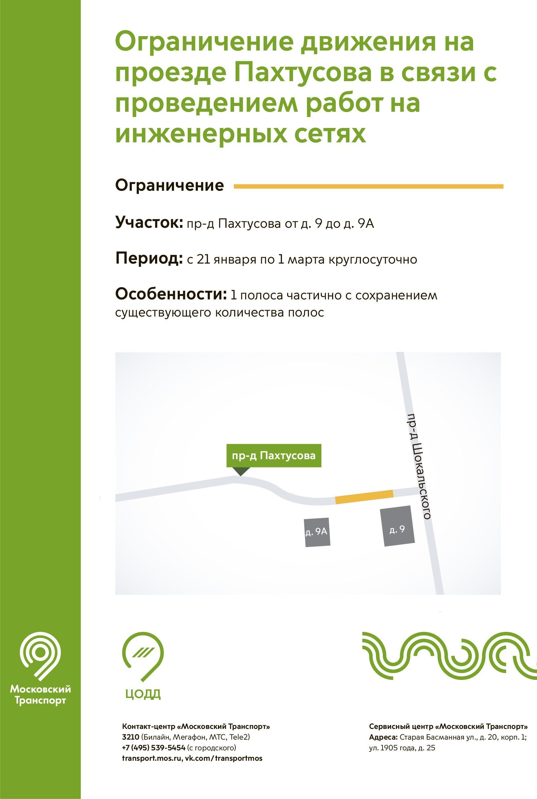 С 21 января по 3 марта для проведения работ на инженерных сетях круглосуточно ограничено движение по одной полосе на участке проезда Пахтусова от дома 9 до дома 9а.