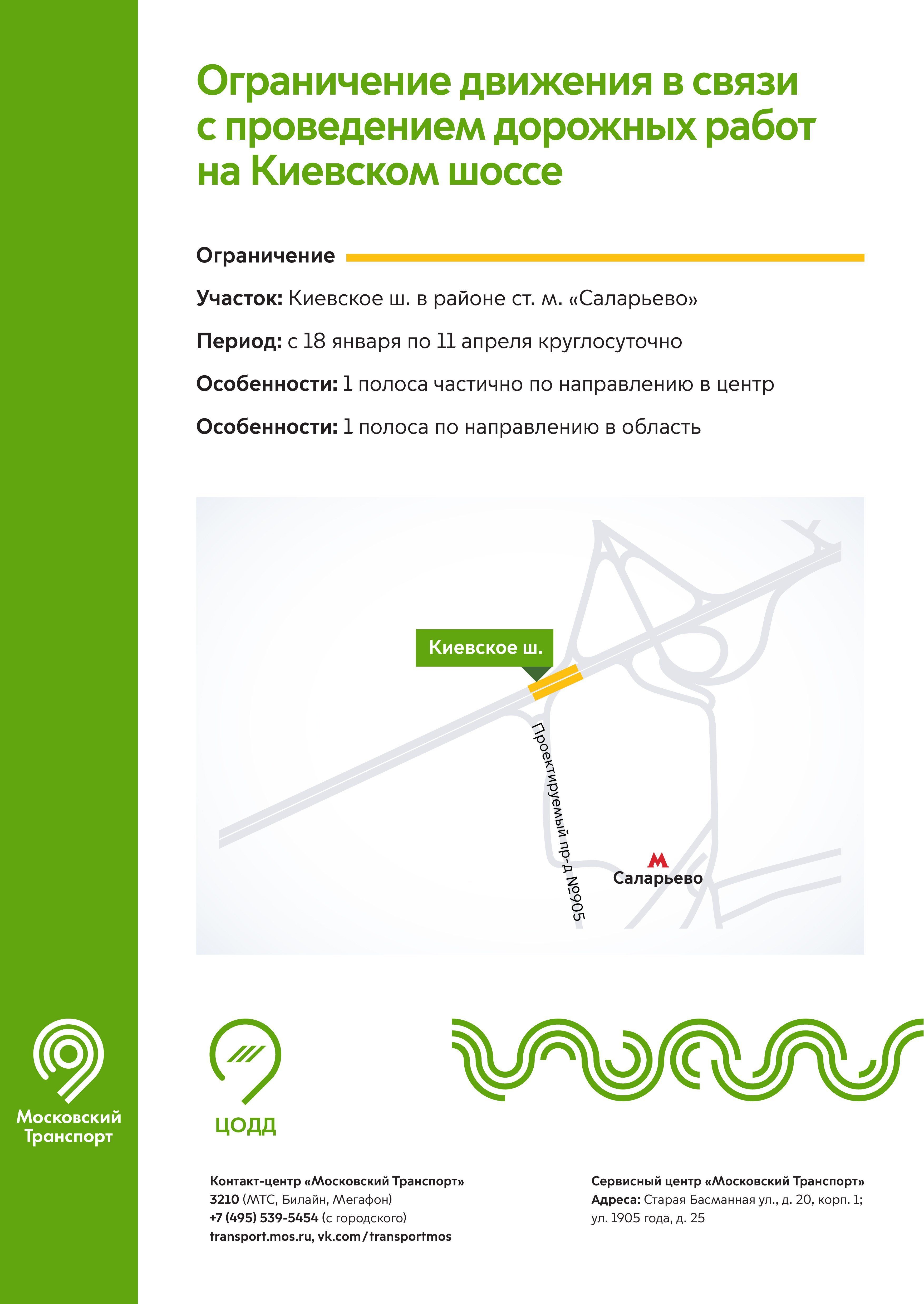 С 18 января по 11 апреля ограничено движение на Киевском шоссе в районе станции метро «Саларьево» по одной полосе в обоих направлениях. На этом участке проводятся дорожные работы.