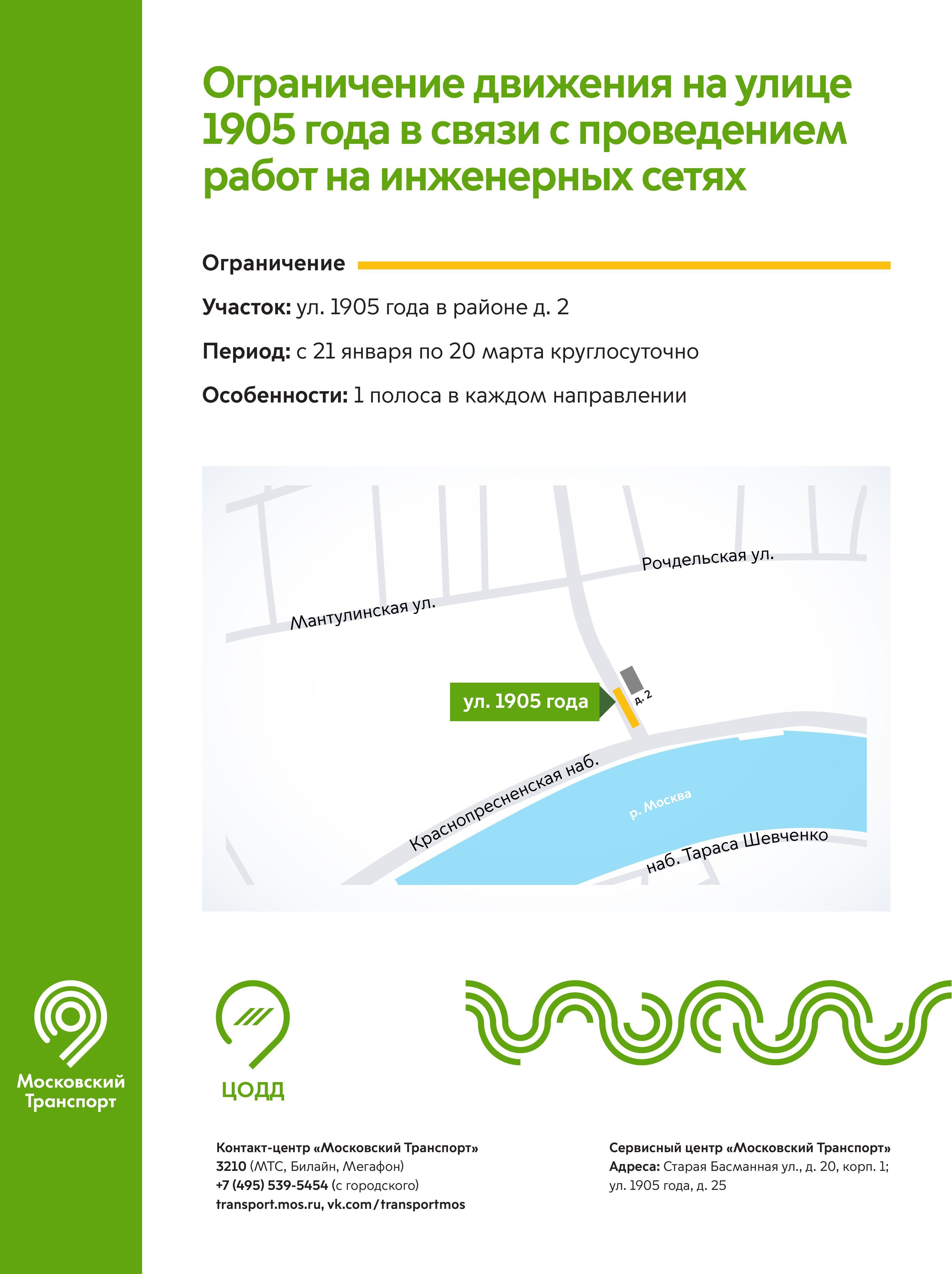 На улице 1905 года до 20 марта круглосуточно ограничено движение по одной полосе в каждом направлении.