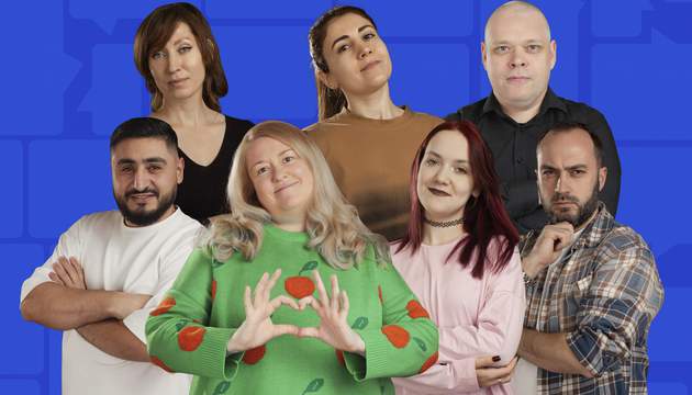 Только опытные комики! На сцене: Ольга Боровская, Мел Бернецян, Илья Емелин, Антон Погосян, Ксения Жучкова, Вероника Зайнуллина и Артур Киш.