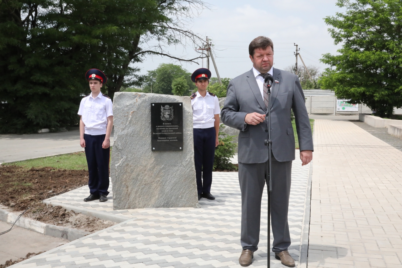 Мемориальный камень войнам-ставропольцам, на котором нанесены слова благодарности от жителей Ставрополья, открыли председатель Думы края Геннадий Ягубов и спикер Государственного Совета Крыма Владимир Константинов.