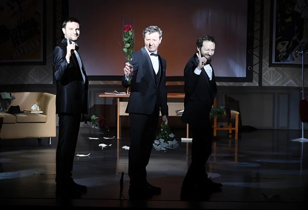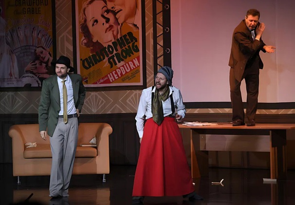 Запертый офис, бессонница, нервы, рядом продюсер с клюшкой для гольфа бродит. Вроде так всё оно и было, если в интернете поискать. Просто мы не ручаемся, что реальность была столь гомерически смешной, как это получилось у режиссёра спектакля Гарольда Стрелкова и актерской труппы.