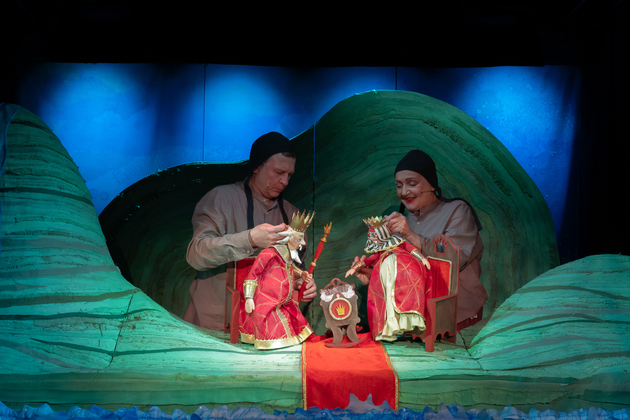 Мир спектакля — это пригорок, ручеек, лесок… Населяют его персонажи сказки: Царь, Царевна, Царица, Женихи и сам Суженый. Все это – планшетные куклы. Артисты явно управляют ими и время от времени дают им советы. В спектакле есть и тростевые, и перчаточные куклы, есть даже одна кукла, природу которой затруднился определить сам мастер-технолог!